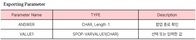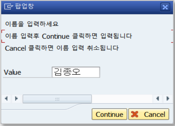 Cancel 버튼을 누를 경우 팝업 창을 나가게 되며 Exporting Parameter answer를 통해 A값을 반환받고, 사용자가 입력한 value1 값을 반환받지 않습니다.