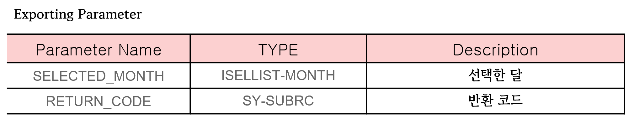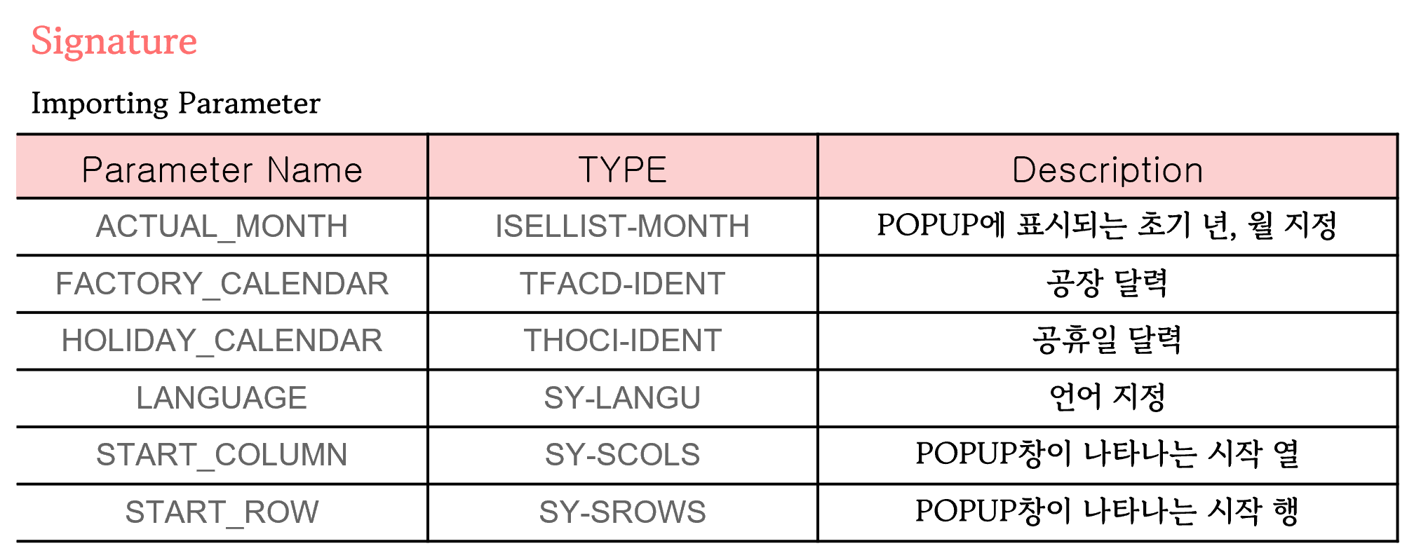 actual month(현재 월)의 gv_month 는 sy-datum의 시스템 필드의 형식의 변수이고, sy-datum+0(6)를 통해 기존 8자리에서 현재의 연도와 월만 보이도록 6자리로 줄였습니다. 해당 값은 처음 POPUP창을 띄울 때 들어가 있는 월을 지정할 수 있습니다. POPUP창에서의 나오는 연도와 달의 Drop Down List에서 선택 가능한 값은 function의 signature 에서 Factory Calender(공장 달력)와 Holiday Canlender(공휴일 달력)의 값으로 결정을 하는데 두 개의 Parameter의 Default값으로 SPACE인데 두 개의 Parameter가 전부 SAPCE일 경우 현재 년도에서 -50년 , + 50 년으로 Year의 Drop down list 값이 출력됩니다. 그리고 Factory_Calendar 와 Holiday_Calendar 에 모두 ID를 입력한다면 Factory_Calendar 의 ID 값에 따른 Year 범위가 출력 되기 때문에 공장 달력이 우선순위가 높은 것을 알 수 있습니다.