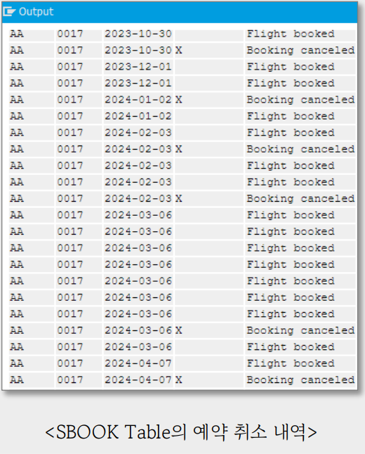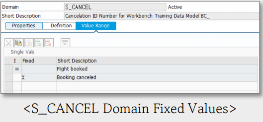 GET_DOMAIN_VALUES Function 에서 S_CANCEL 의 Domain의 정보를 가져와 SBOOK Table에 있는 예약 취소 여부 Colum( 열 ) 의 데이터 (SPACE or X) 를 Dictionary에 명시 되어있는 Fixed Value를 참고하여 ‘SPACE’에는 “Flight booked”라는 텍스트를 불러오며, ‘X’에는 “Booking canceled”라는 텍스트가 불러오게 됩니다. 이러한 텍스트를 불러오는 과정은 LOOP문을 활용하여, Function를 통해 불러 온 Fixed Value 와 SBOOK 의 ‘CANCELLED’ Colum를 비교하여 맞는 ‘DDTEXT’설명을 부르는 형식을 가지고 있습니다.